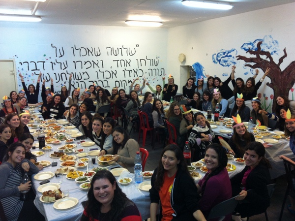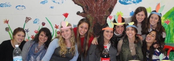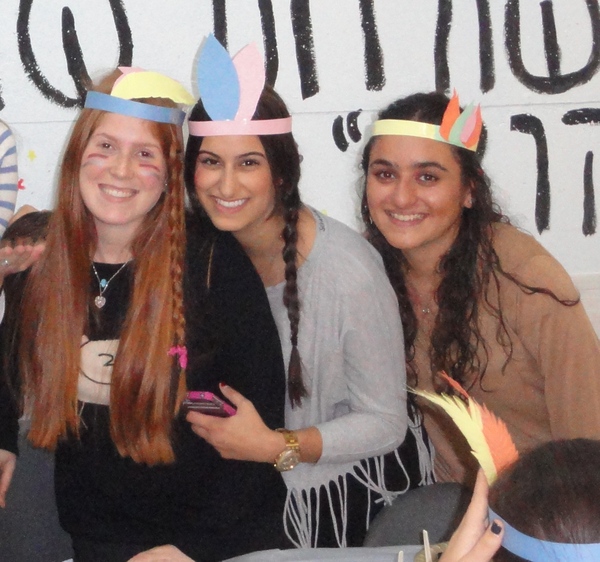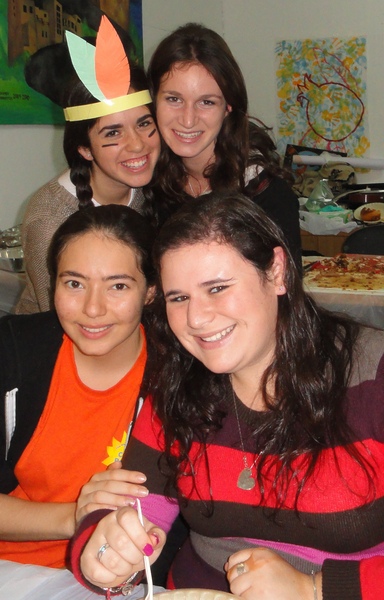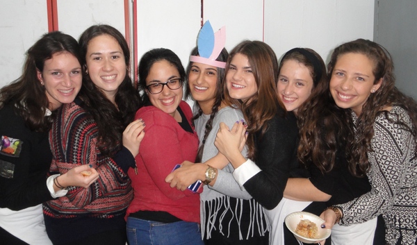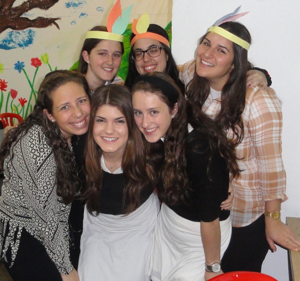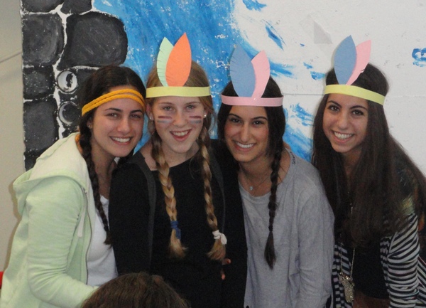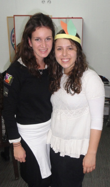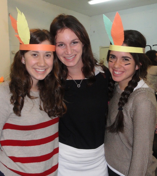 In honor of Thanksgiving, Dara Zukerman and Kayla Krok, recruited all the students (yes, Canadian and English as well) to prepare a school wide thanksgiving meal. Together they created a wonderful, abundant, delicious meal: sweet potato pie, various salads, mashed potatoes, and of course classic turkey and stuffing provided by our caterer. Many girls also dressed up festively as Pilgrims and Indians in honour of the Thanksgiving meal.